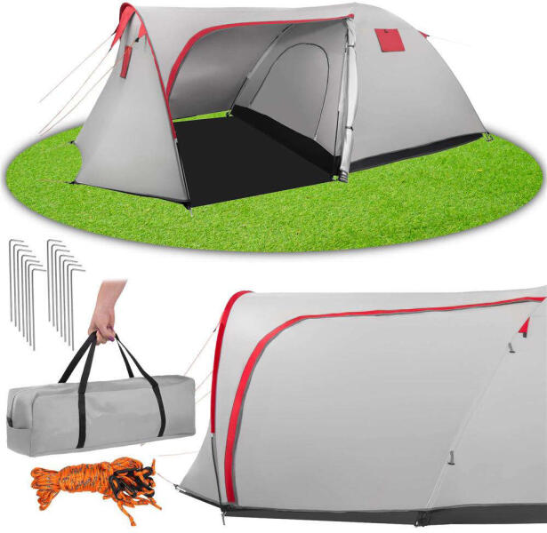 Springos® 4 Fős Kempingsátor: Tökéletes kényelem a szabadban ?️ Ez a Springos® kempingsátor ideális választás a természet szerelmeseinek, akik kényelmes és tágas sátrat keresnek 4 fő részére. A szürke és piros színkombinációja modern és stílusos megjelenést kölcsönöz. Főbb jellemzők:Térfogat: Bőséges helyet biztosít 4 fő számára. Anyag: Strapabíró, vízálló és UV-álló poliészter-oxford szövet PU bevonattal. Váz: Erős üvegszál váz a stabilitásért. Méret: 350 x 200 x 135 cm (felállítva), 64 x 16 x 16 cm (összecsukva) Kényelem: Szúnyoghálóval ellátott szellőzőablakok a kellemes klímáért. Praktikus: 1 fő rekesz + 1 előszoba, belső zseb és lámpatartó. Tartozékok: Padló az előszobához. Könnyű szállítás: Kényelmes fogantyúval ellátott hordtáska. Részletes specifikáció:Jellemző AdatMárka Springos®Szín Szürke/PirosSzövet Poliészter-oxford PU bevonattalVáz anyaga ÜvegszálMéret (felállítva) 350 x 200 x 135 cmMéret (összecsukva) 64 x 16 x 16 cmSúly 3,8 kgFérőhelyek száma 4Rekeszek száma 1 + 1 előszobaRúdvastagság 7,9 mmÉlvezze a szabadban töltött időt kényelmesen és biztonságban ezzel a kiváló minőségű Springos® kempingsátorral!