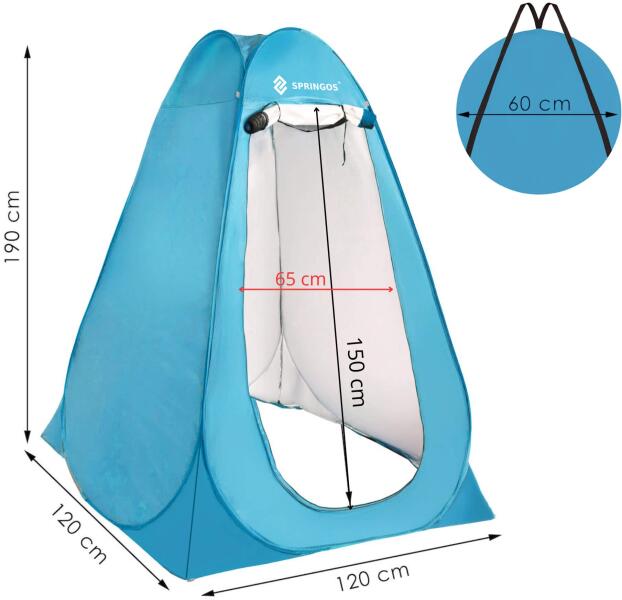 Alapadatok:Márka: Springos®Anyag: poliészterSzerkezet anyaga: acélSzövet típusa: 170TSzín: kékZárás: kétoldalas – cipzárPadlónélküliMéret:Külső: 120 x 120 x 190 cmZsebek: 23 x 17,5 cmTetőablak (téglalap alakú): 27 x 25 cmFalablak (félkör alakú): 35 x 15 cmAkasztópánt vastagsága: 2 cmAkasztópánt hossza: 49 cmBejárat magassága: 150 cmBejárat szélessége (mérve fél magasságnál): 65 cmÖsszehajtott méretek: 60 x 60 cmTovábbi információk:Az alapon lévő sarkokon 3 rögzítő található 3 cövekhez, amellyel a talajhoz rögzíthetőUV védelemVízállóságA falak minden sarkánál felül 4 rögzítő található, amelyeken keresztül átfűzheti az erősítőzsinórokat, így stabilizálva, hogy ne inogjon a szélbenBelső zseb kiegészítők számáraKét pánttal ellátott huzat, amely hátizsákként hordozhatóKét kis ablak - egy a mennyezeten, másik a falonSzéles akasztópánt pl. törölköző számáraCipzáras huzat kényelmes fogantyúkkal ellátott táskaként, amely a vállán is hordhatóA készlet tartalma: 4x cövek és 4x kötélA terméken és